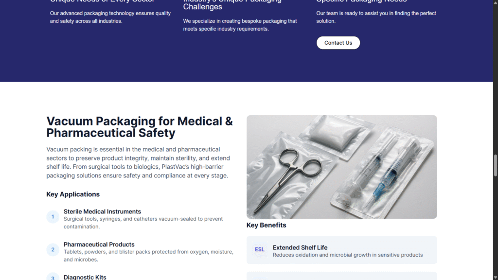 • Industry-specific pages (food packaging, medical/pharma, electronics) detailing solutions with clear imagery and value propositions